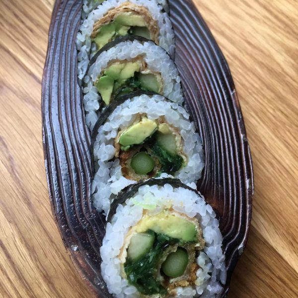 Avocado, agurk, tempura asparges sylte japansk radise og Mixsalat
