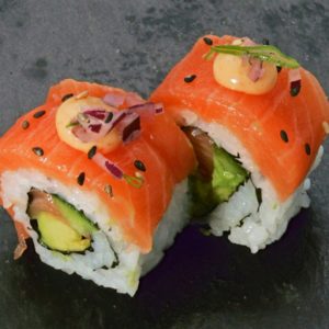 Avocado, agurk, tempura asparges, toppet m. avocado, teriyaki og sesam