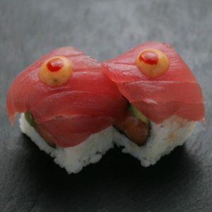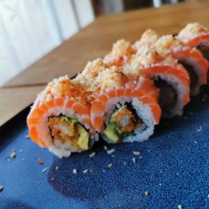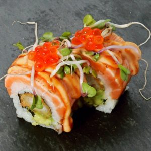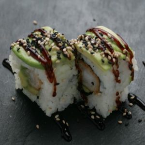 Avocado, agurk, tempura asparges, toppet m. avocado, teriyaki og sesam