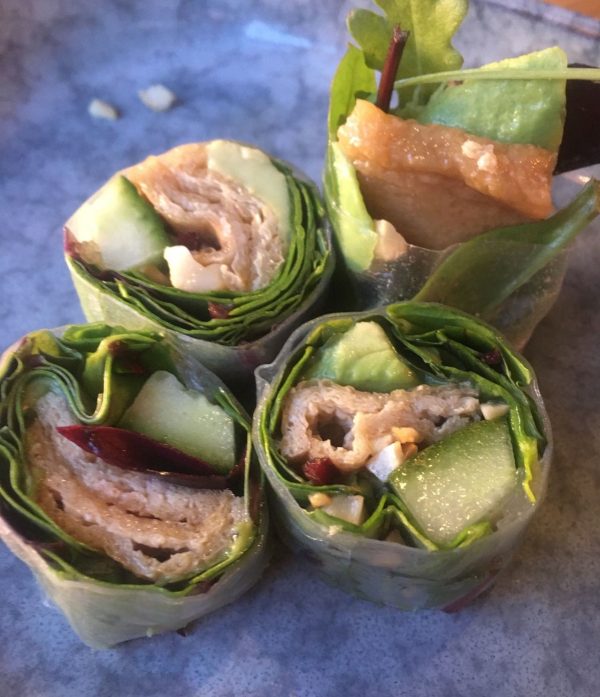 Avocado, agurk, salat, sylte japansk radise og goma dressing
